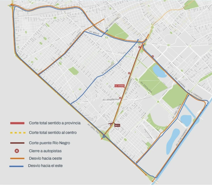 Por su parte, el tránsito que llegue por la Riccheri hacia Capital será desviado a la General Paz, con opciones como Avenida 27 de Febrero, AU7 Cámpora, Avenida Roca, Alberdi–Bruix–Directorio/San Juan o Perito Moreno.